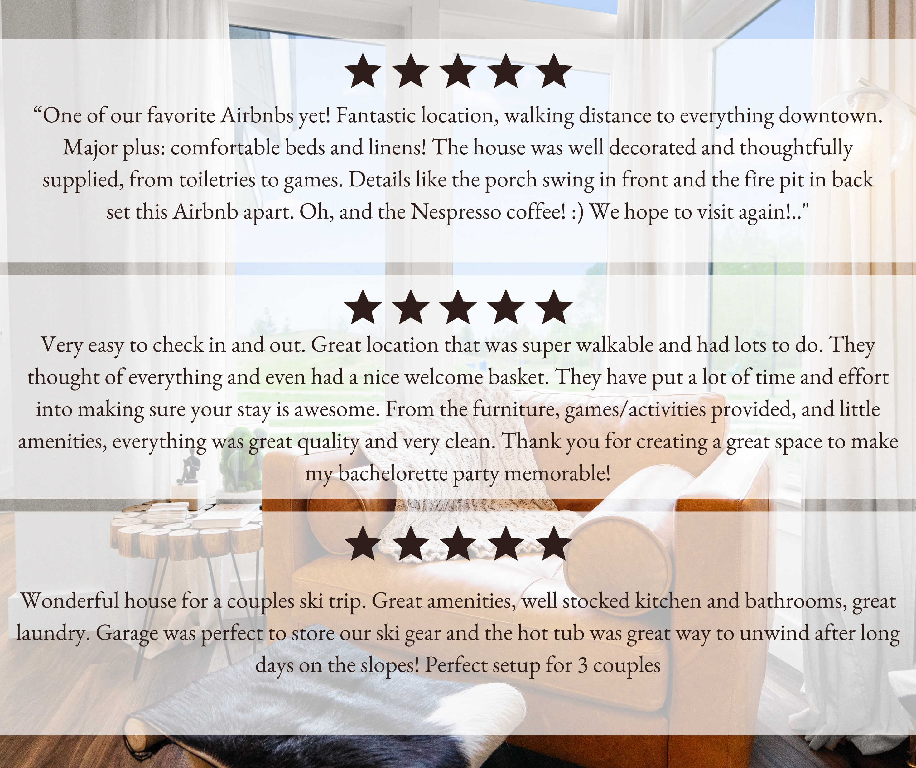 Here you’ll find a snapshot of reviews from our wonderful guests, showcasing the quality and care we put into our properties. With about 150 bookings to date, we have never received less than a 5 star review!